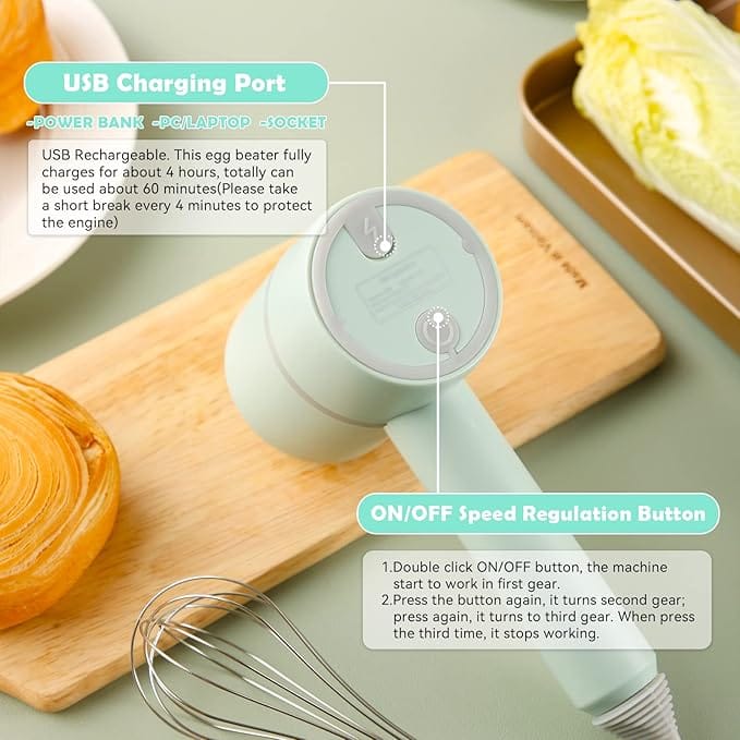 Introducing the ultimate kitchen companion designed to make baking easier and more enjoyable. This innovative tool features an ergonomic handle that won't slip, even when your hands are wet. You can easily switch between the egg beater and garlic masher, making it a versatile assistant perfect for any baking project. Plus, its adjustable speed allows you to customize the intensity of your mixing, tailored to your needs.
