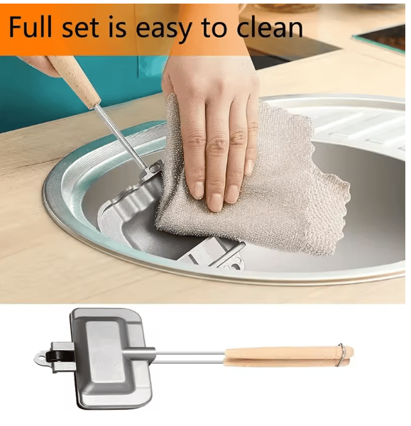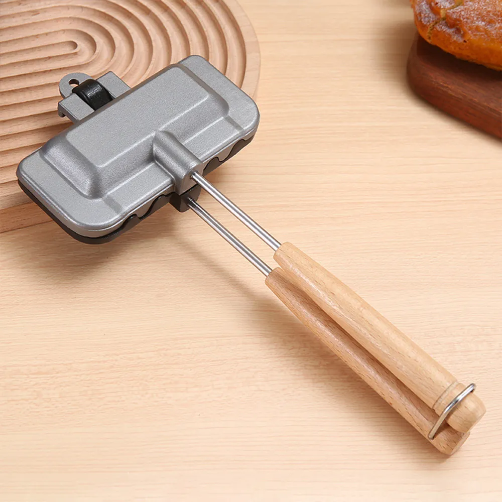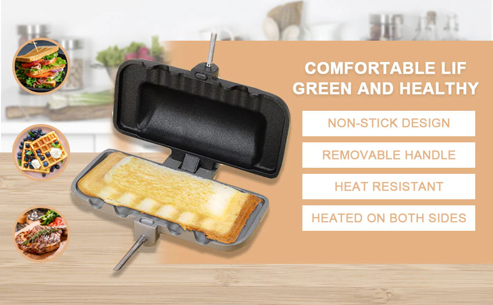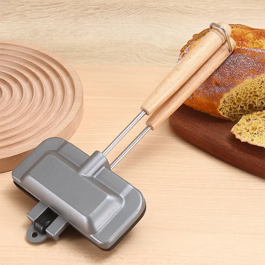 This double-sided sandwich maker offers the quickest and simplest way to create a perfect grilled cheese sandwich. With its easy heating, flipping mechanism, and a sealed cooking environment, it locks in the heat while preserving the food's original flavor, ensuring a delightful breakfast experience. Remember to tighten the handle for optimal use.